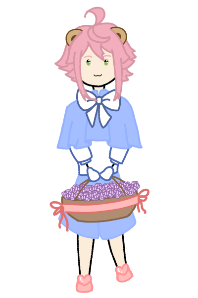 The pink-haired boy holds out a basket full of flowers that are the same kind as what you just picked up. You gently put the flower with the others, and you hear him chuckle as you step away.